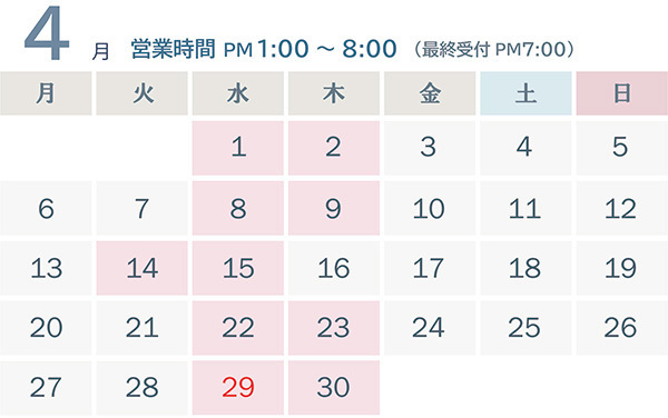 臨床気療法士の施術受付可能日を記載したカレンダーをアップしています。